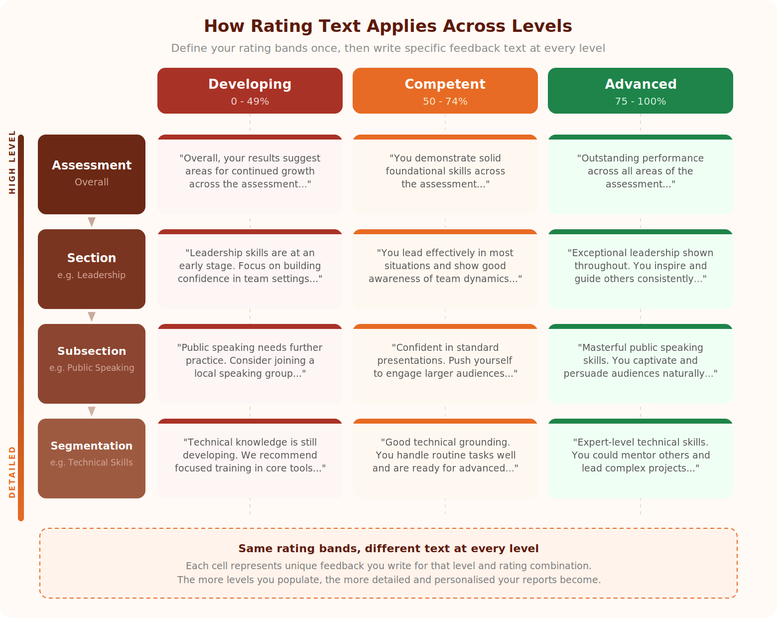 The diagram below shows how this works. You define your rating bands once (for example, Developing, Competent, and Advanced), and then write unique feedback text for each band at every level you want to report on: