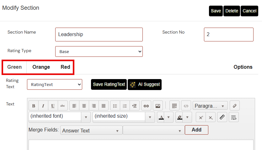 The Rating Text fields on the Rating Edit form are for the assessment-level feedback. This is the text that appears when you use assessment-level rating merge strings in your report. To write rating text at the section, subsection, or segmentation level, see Applying Rating Text Across Levels below.
