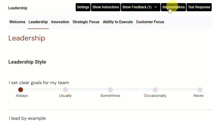 Segmentation-level rating text provides feedback for cross-cutting groups of questions or answers that may span multiple sections and subsections. This is useful when you want to report on a theme (such as "Technical Skills" or "Communication") that does not align neatly with your section structure. To enter segmentation-level rating text: