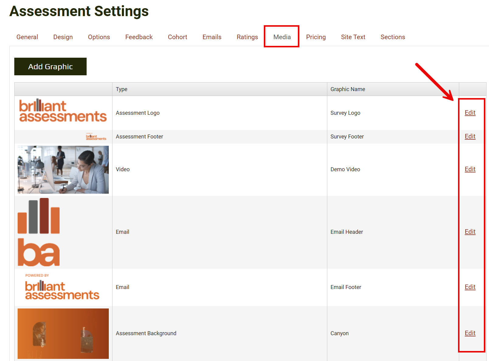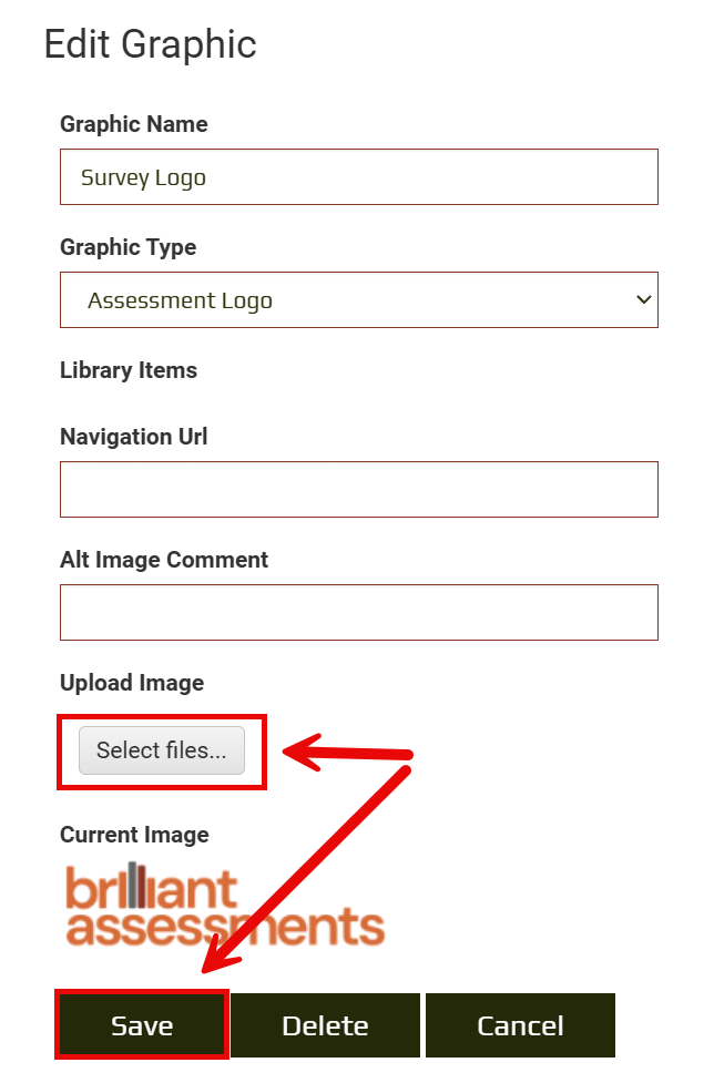 This takes you to the edit screen, where you can replace the Brilliant Assessments logos, using the Upload Image box. Then click Save.