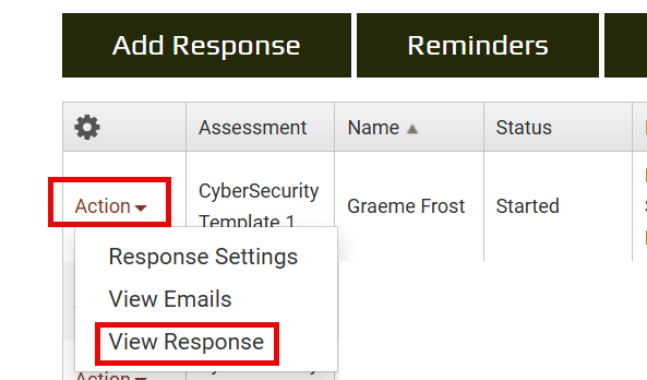 Once you click Save, you should receive an email from the system inviting you to complete the response. You can click the link on that, or you can also view the response from the admin screen by selecting the Action Menu and View Response.