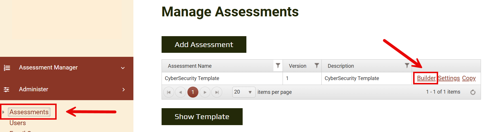 To initiate the Assessment Builder, click Builder on the Assessment.