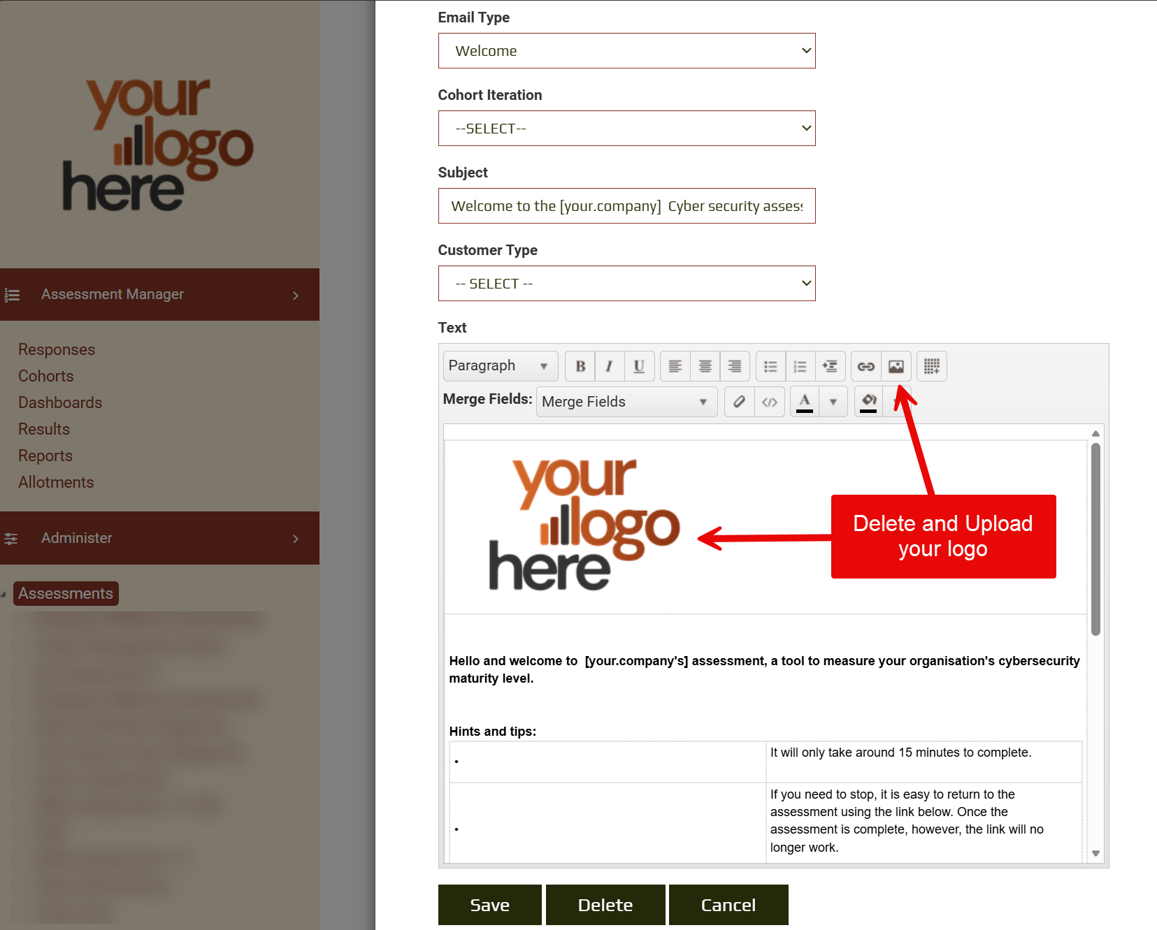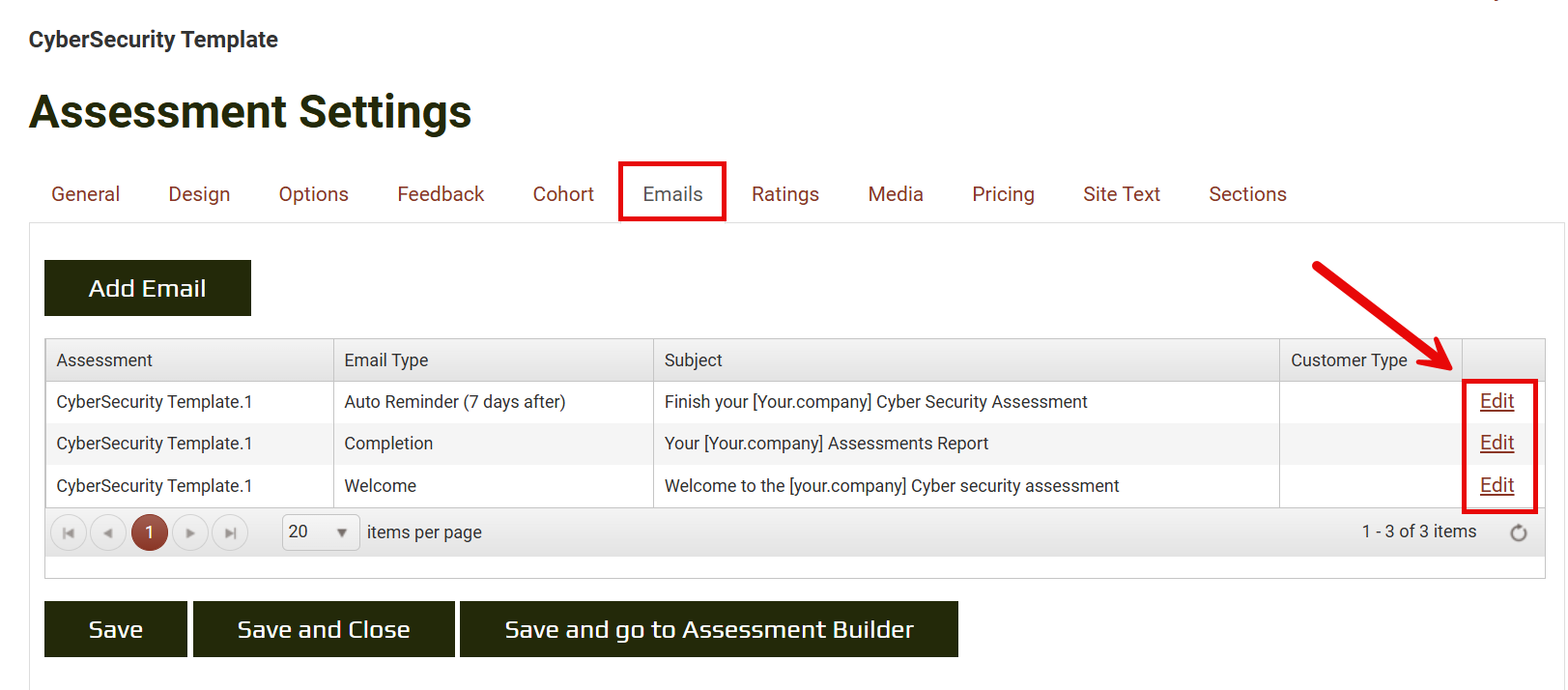 For this assessment, ensure you review and update the Cybersecurity Welcome, 14 Day Delay, and Completion emails, as these are automatically sent at key points during the assessment workflow. Read more on the Email templates.