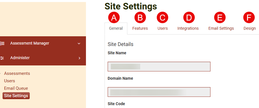 The Site Settings area of your site allows administrators to configure global options and features that define how the platform behaves for all assessments, users, and respondents. This is where you control key site details, enable or disable features, customize global content, and manage integrations.