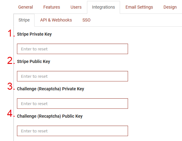 1. & 2.Stripe Keys (Public & Private or they can also be known as Site and Secret) - If you want to charge respondents for assessments using the system, register with stripe.com and record your keys here. For testing, enter the test keys, when in production, enter your production keys. Read more on integrating with Stripe