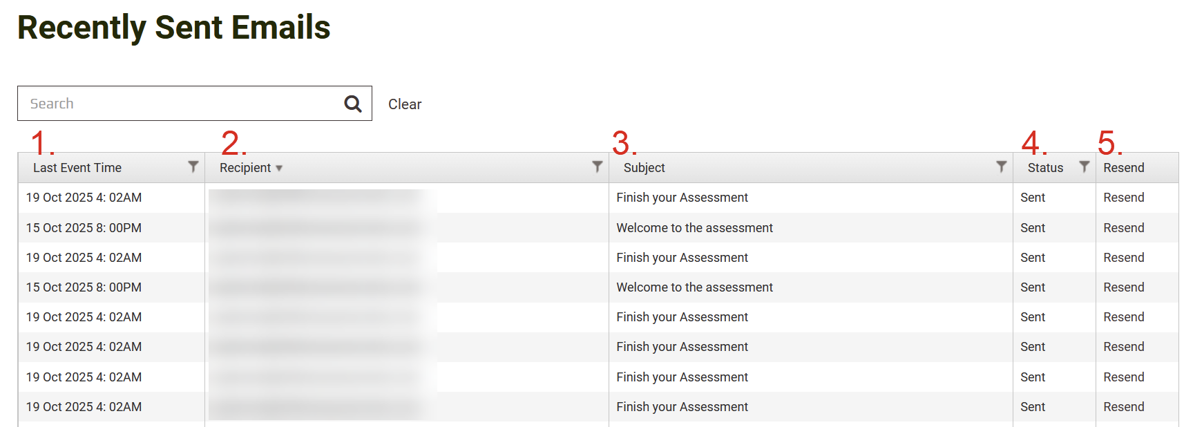 3. Subject The subject line of the email that was sent. This helps you quickly identify the type of email (e.g., "Welcome to the assessment", "Your Assessment Report", "Cohort Report OnDemand").