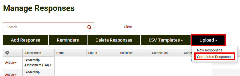 Return to the Response List screen, click Upload, and select Completed Responses. Choose your completed CSV file and upload it.