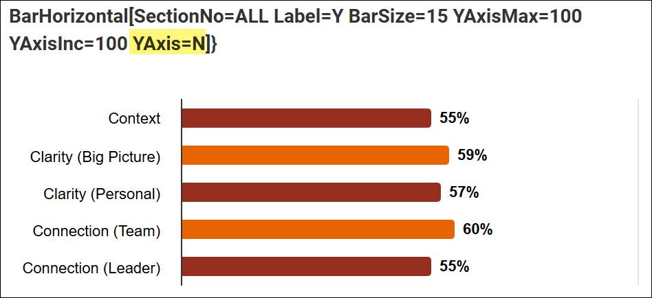 Horizontal bar charts: Ensure the chart is wide enough for value labels to display outside the bars. If numbers overlap the bars, increasing the YAxisMax value can help (see FAQs below). You can also use the BarSize parameter to control bar thickness (20-40px is typical, 30 is average).