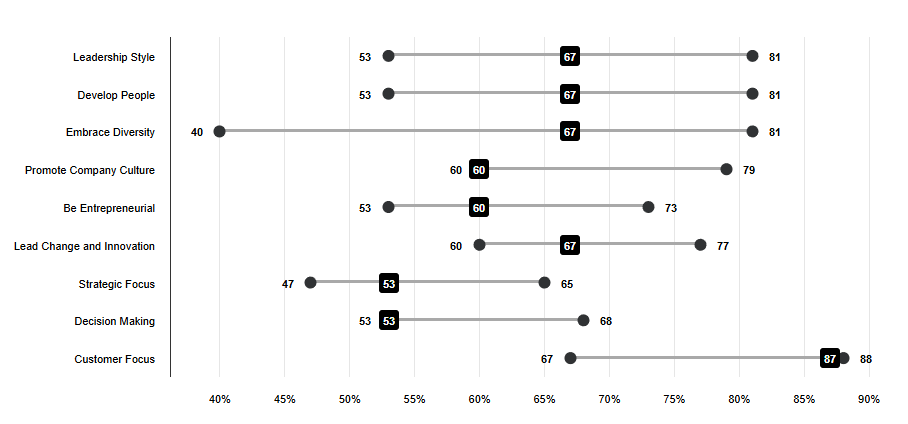 Box and Whisker charts are designed for cohort reports where you want to visualise how scores are distributed across respondents. Each row shows a minimum bubble, a maximum bubble, a connector line (the "whisker"), and a median score. When the box is enabled, it highlights the middle 50% of responses (the interquartile range).
