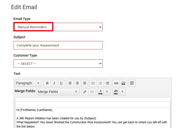 - Add the template. Go to Assessment Settings > Emails > Create a new email template for the assessment and set its type to Manual Reminder. See Choosing the Right Email Template for how to add this email type.