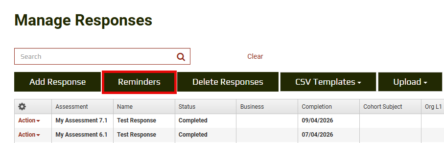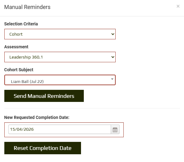 Manual reminders are sent to responses that haven't been completed. You can target them at the Assessment, Group, Cohort or Organization level.