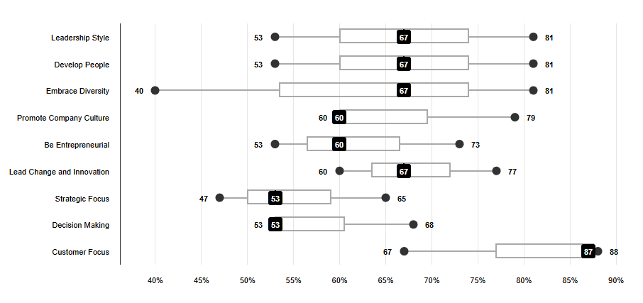 Box and Whisker is a new chart type for Cohort Feedback Reports. It shows the spread of scores across your cohort for each section, subsection, question, or segmentation - so instead of a single average value, you can see how widely (or tightly) your respondents agreed.